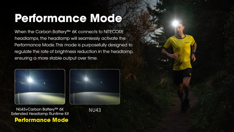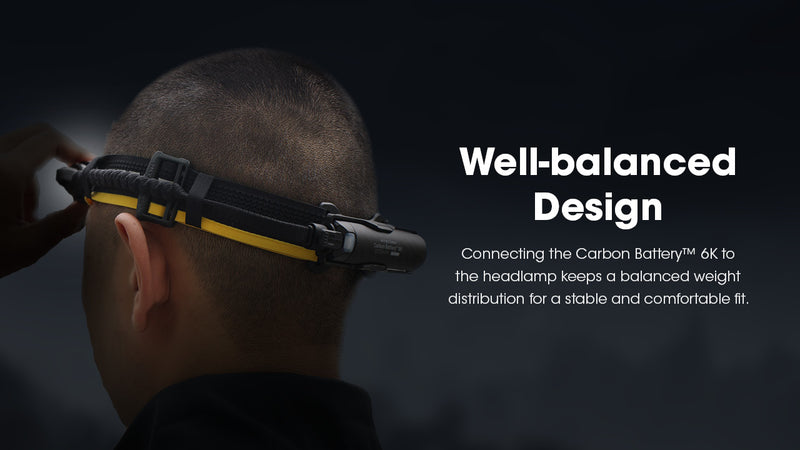 When used with compatible NITECORE headlamps, the Carbon Battery™ 6K offers four major advantages: it balances the weight distribution for a more stable and comfortable wear; effectively extends the headlamp's battery life for longer power support; automatically activates "Performance Mode" to regulate the rate of brightness reduction in the headlamp to ensure a more stable output over time; and prioritizes power from the Carbon Battery™ 6K to preserve the headlamp's own battery.