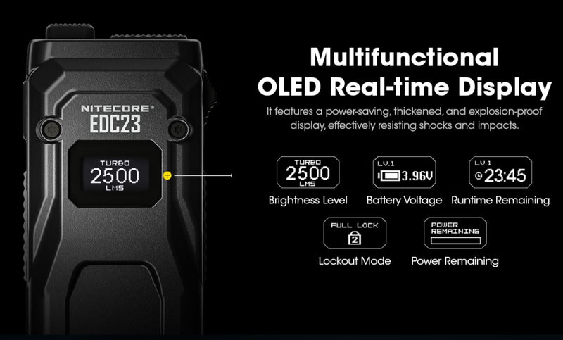 Multifunctional OLED real-time display for brightness level, lumens, battery voltage and runtime, etc.